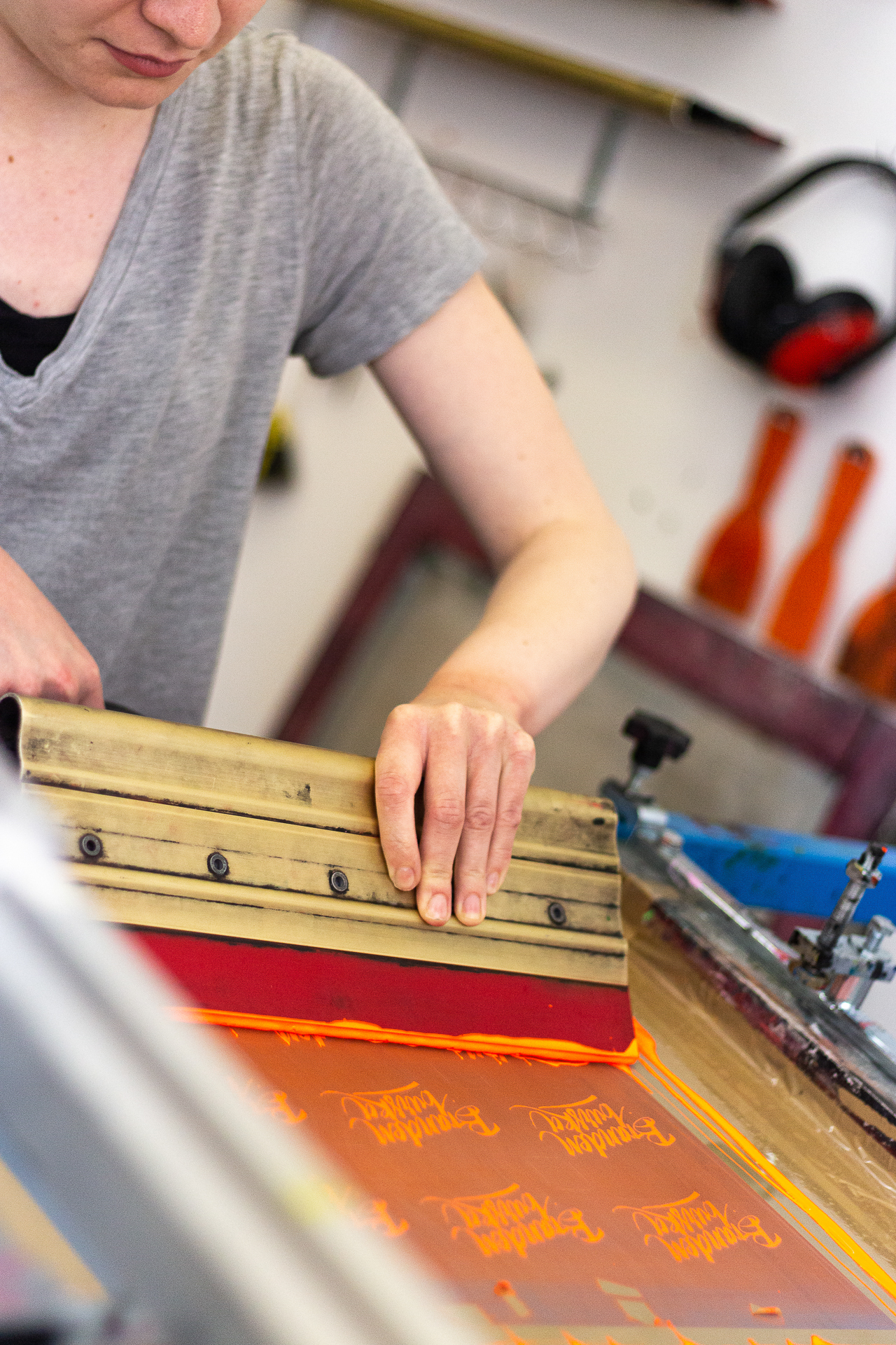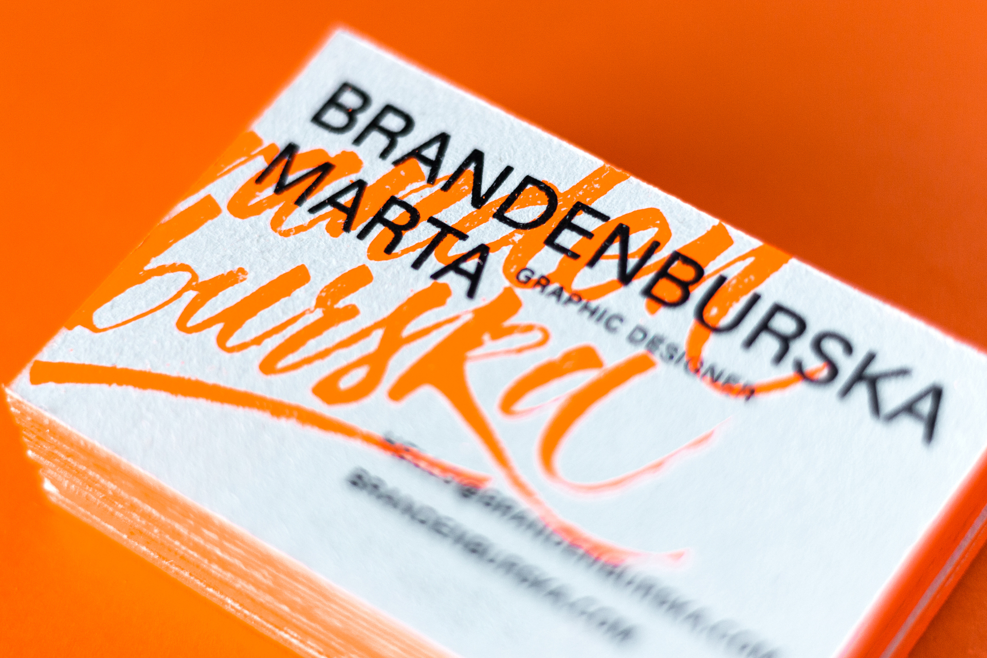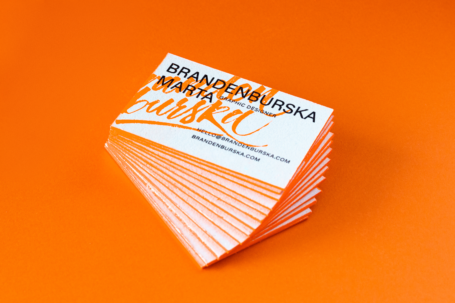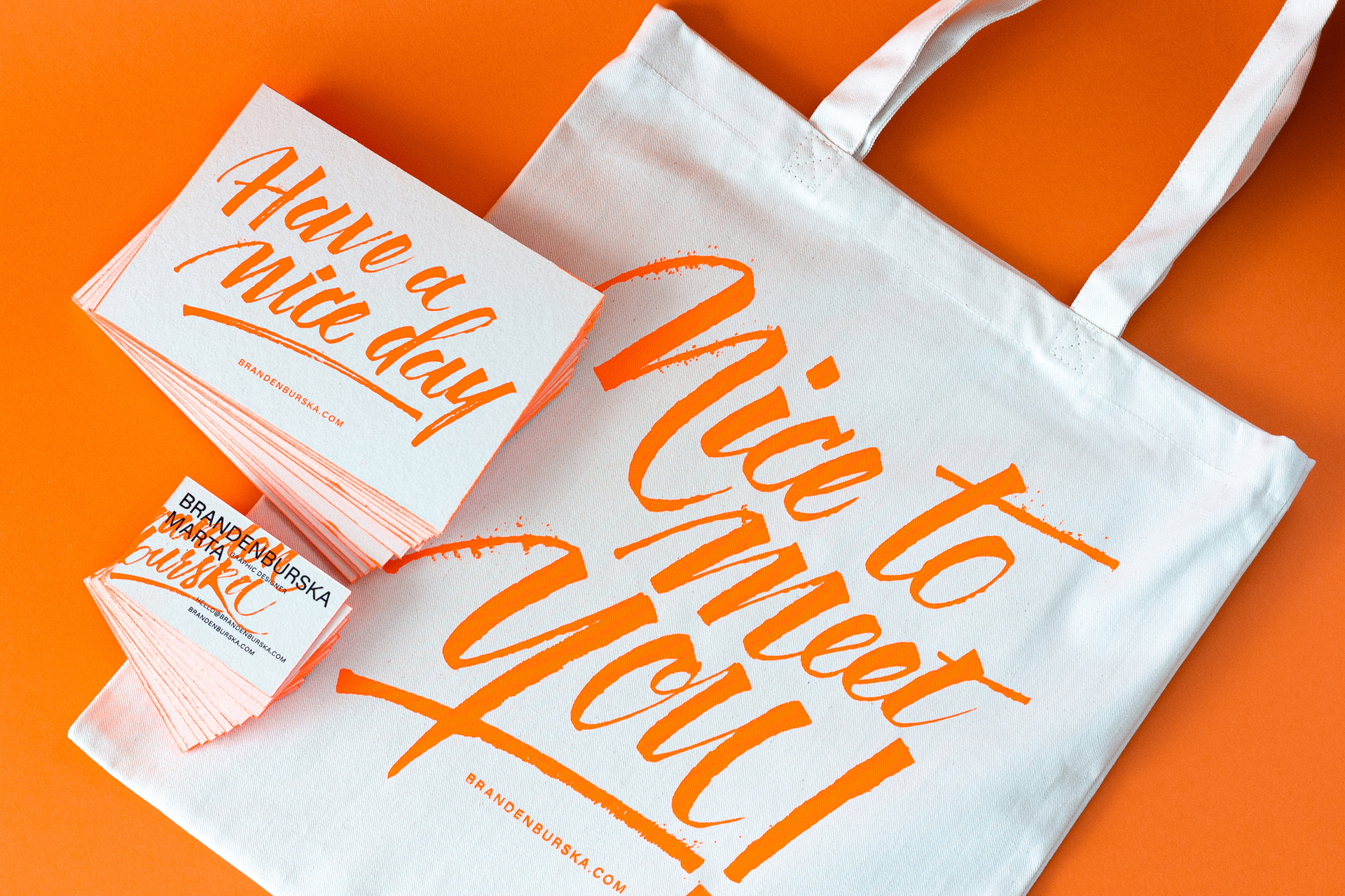 I calligraphed the sentences with a Dreaming Dogs ruling pen, then scanned them, processed them in Adobe Illustrator and printed them using the screen printing technique. I achieved the colored edges of the business cards with graffiti spray.