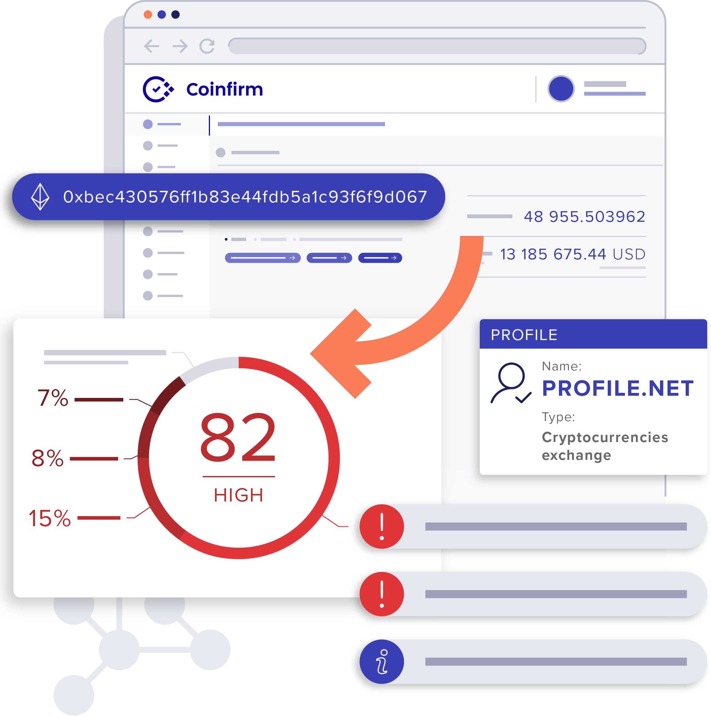 Coinfirm is the industry leader in blockchain analytics and investigations. Illustrations explained the products and services that company provides, for example AML and Reclaim Crypto Services.
