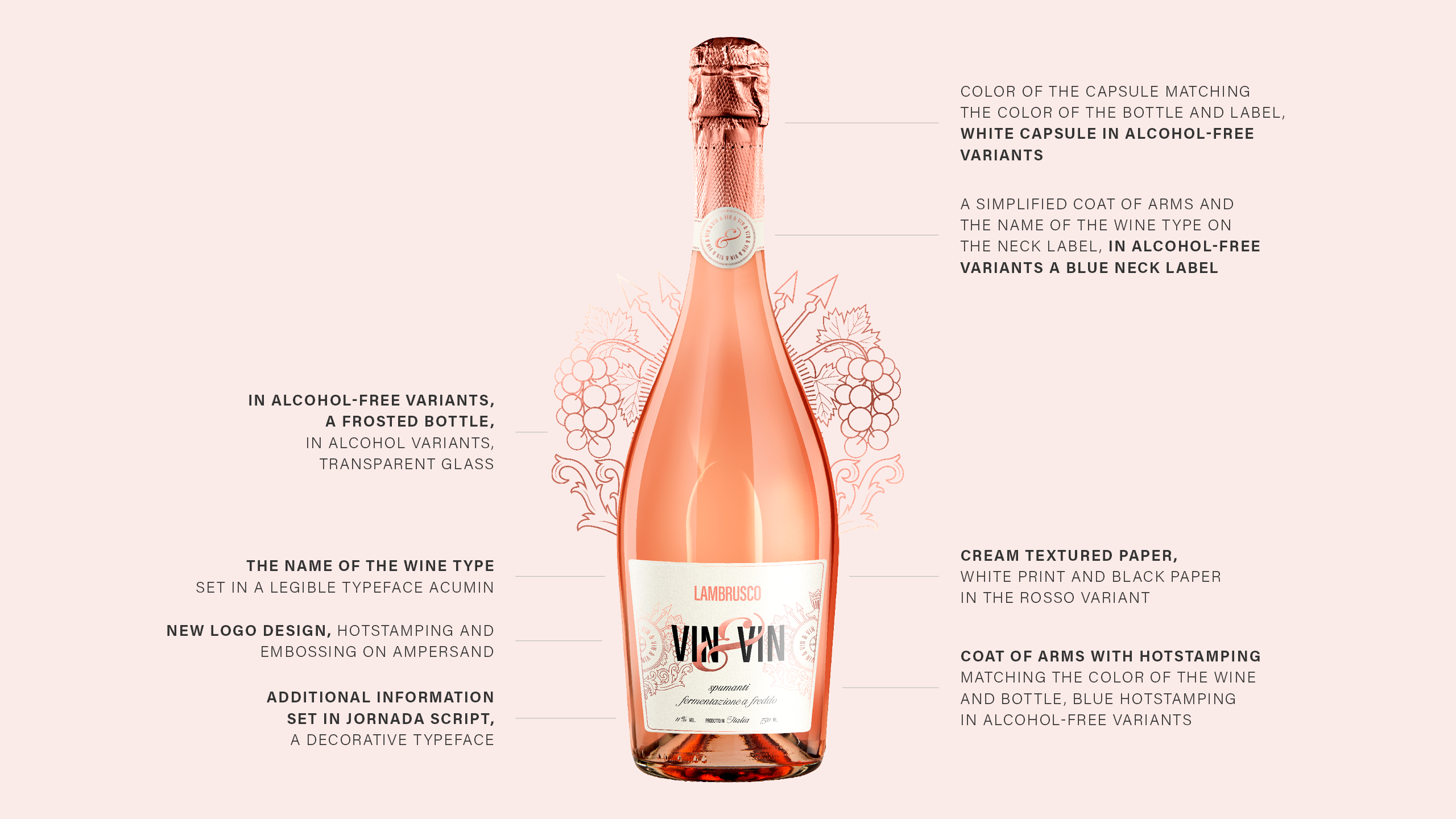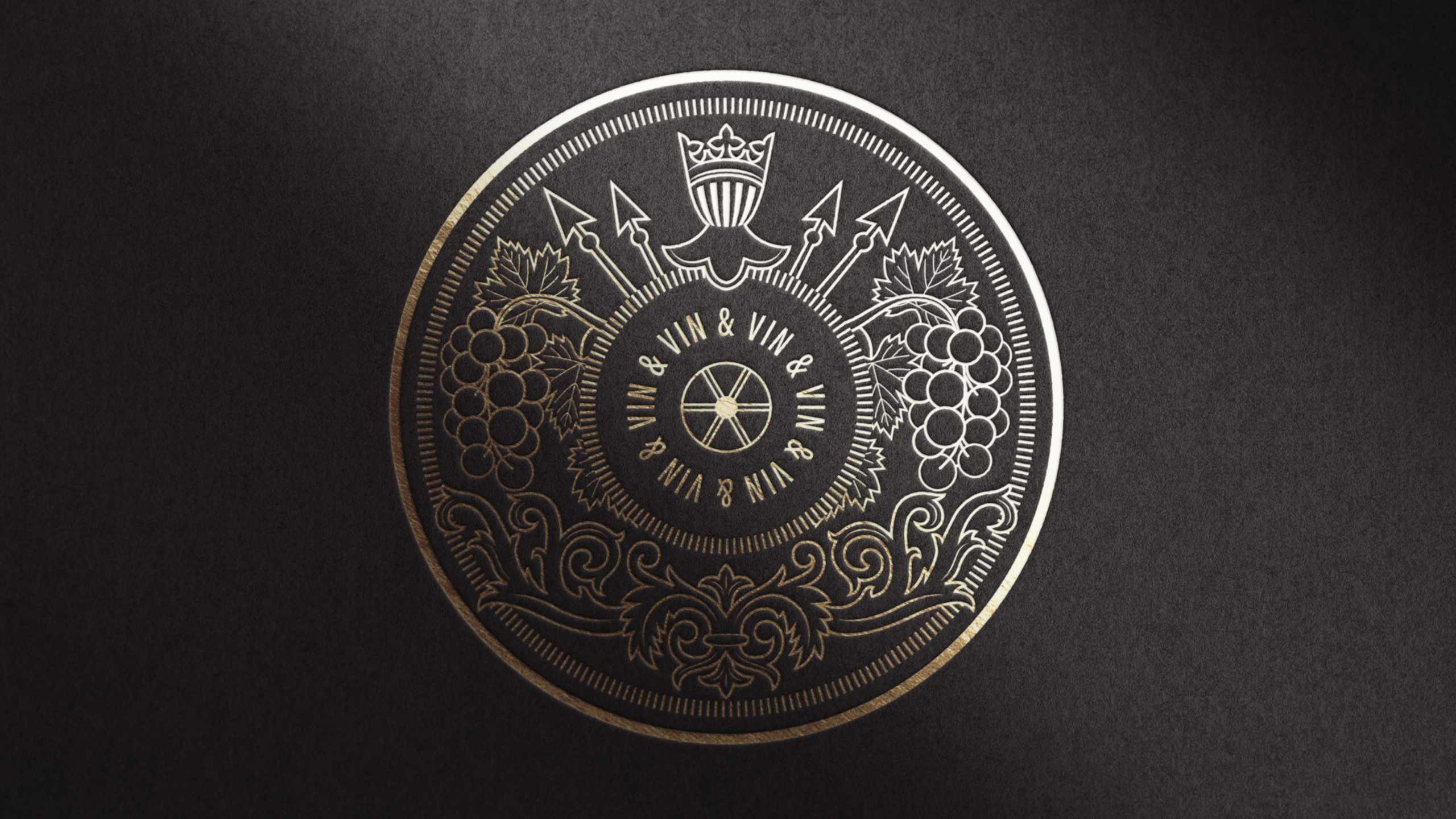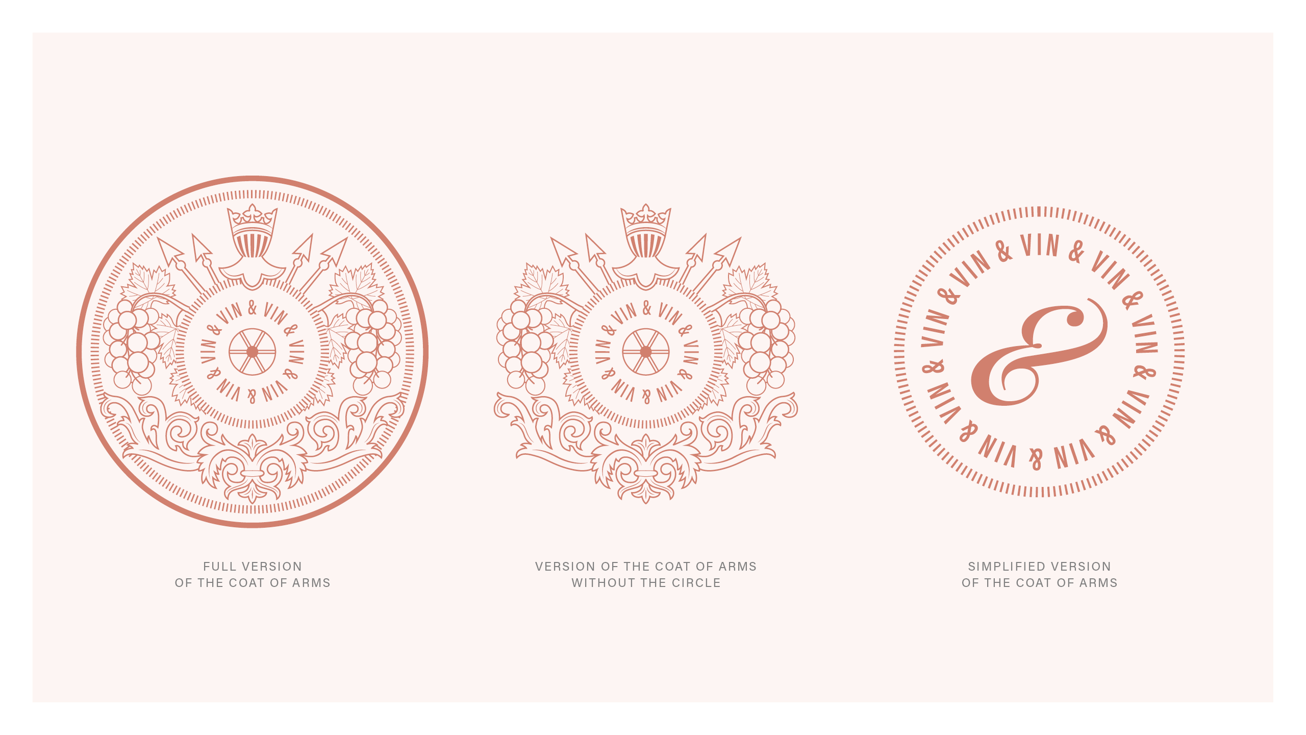 The coat of arms was simplified, the thickness of the lines was unified and adapted to various reproduction techniques, including embossing and hot stamping. I added vines referring to the winemaking process and a helmet with a crown.